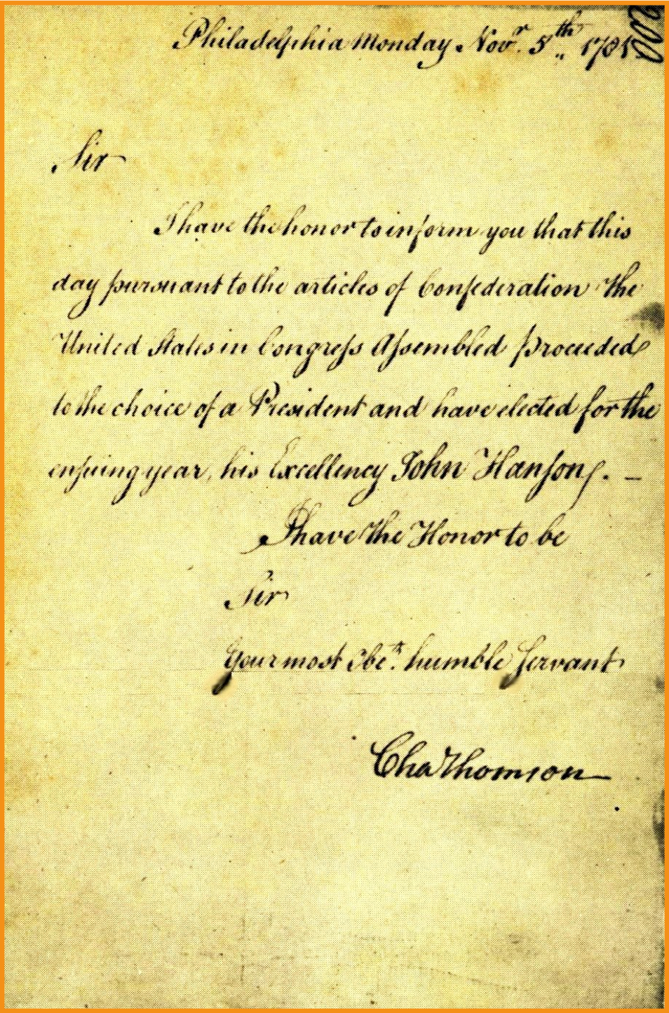 As first act, delegates elect Maryland Delegate John Hanson as president and head of state. There were no other candidates.
